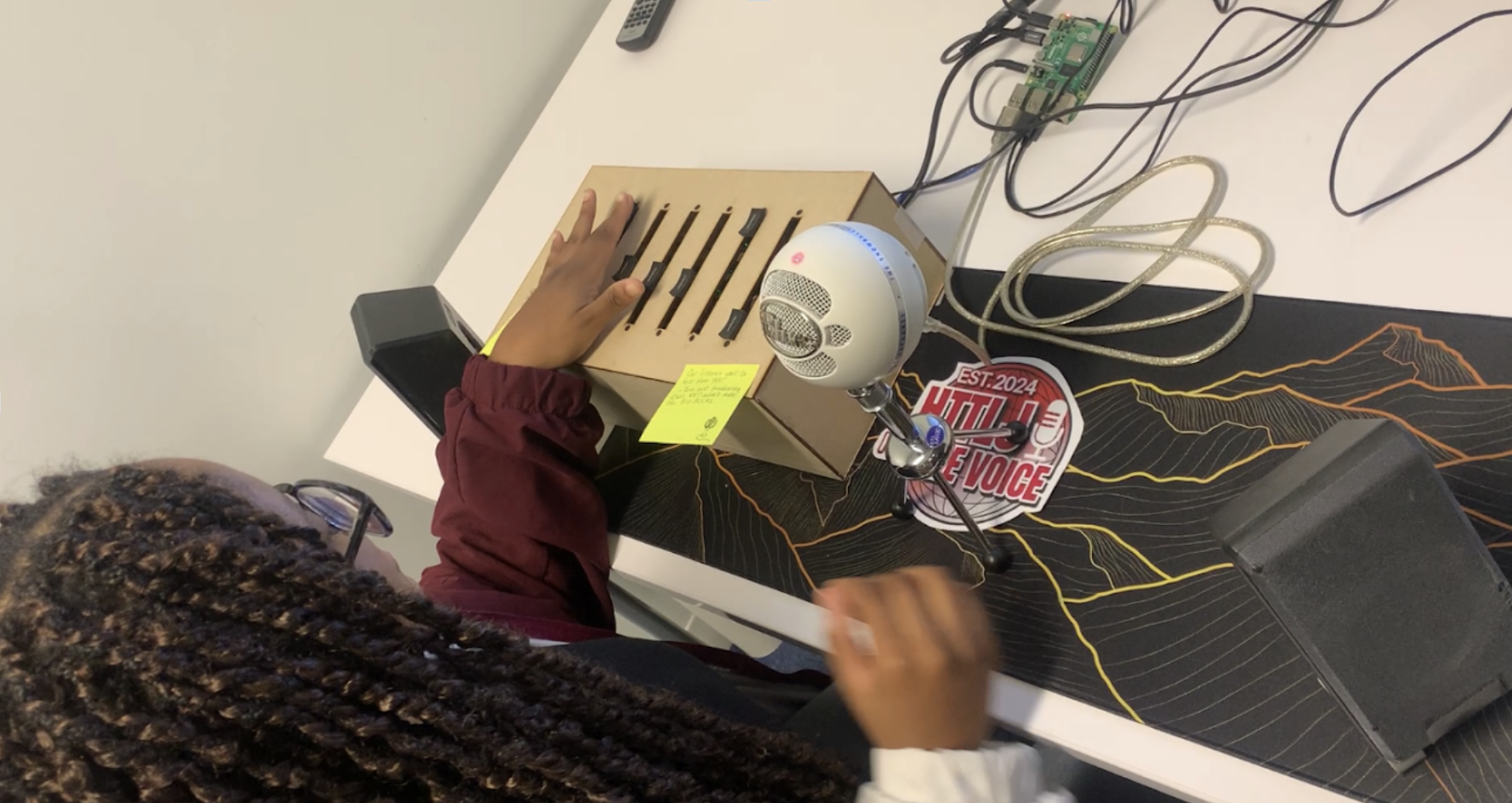 The final exhibit installation consisted of a physical mixing board, a Blue Snowball iCE condenser microphone, and computer speakers. The mixing board was created with a laser-cut wooden console that housed six Arduino-controlled slider potentiometers with 3D-printed slider caps, and a red LED button. The programming for the physical interactions (Arduino), audio mixing (Pygame in Python), and live audio recording (Pyaudio in Python) was housed on a Raspberry Pi.